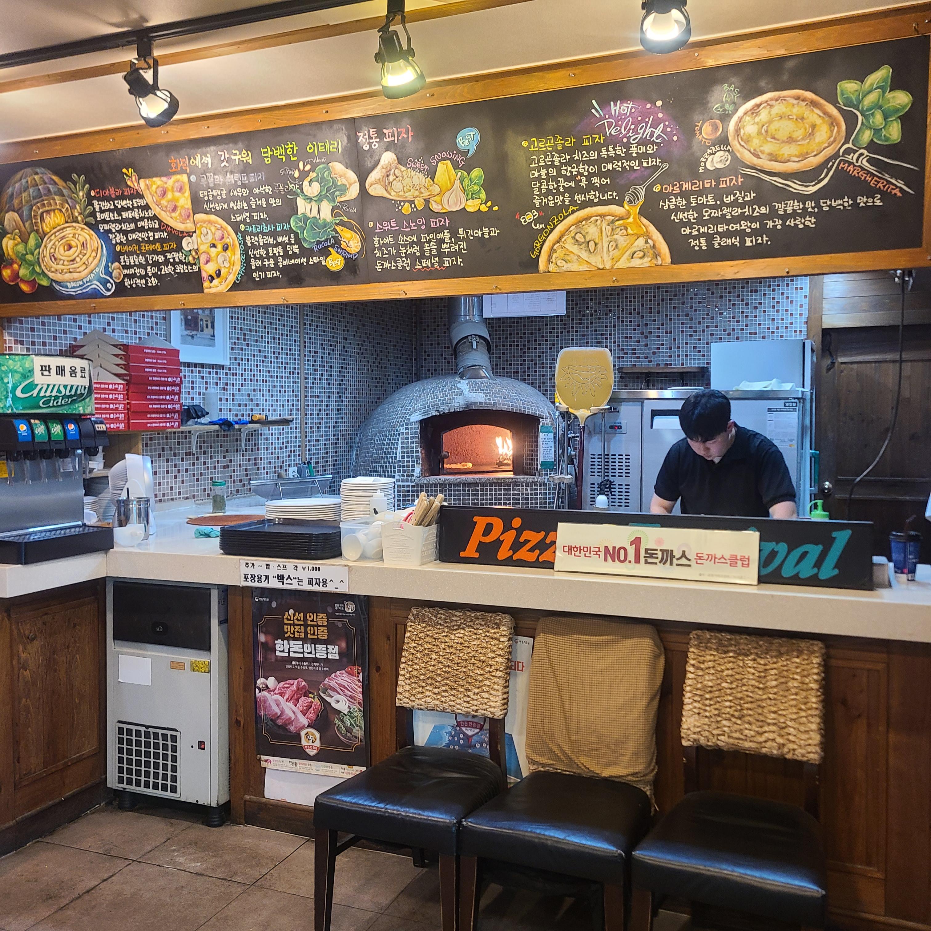 뒤쪽 화덕에서는 피자가 맛있게 구워지고 있는데 고소한 향이 코를 찌르더라고요.