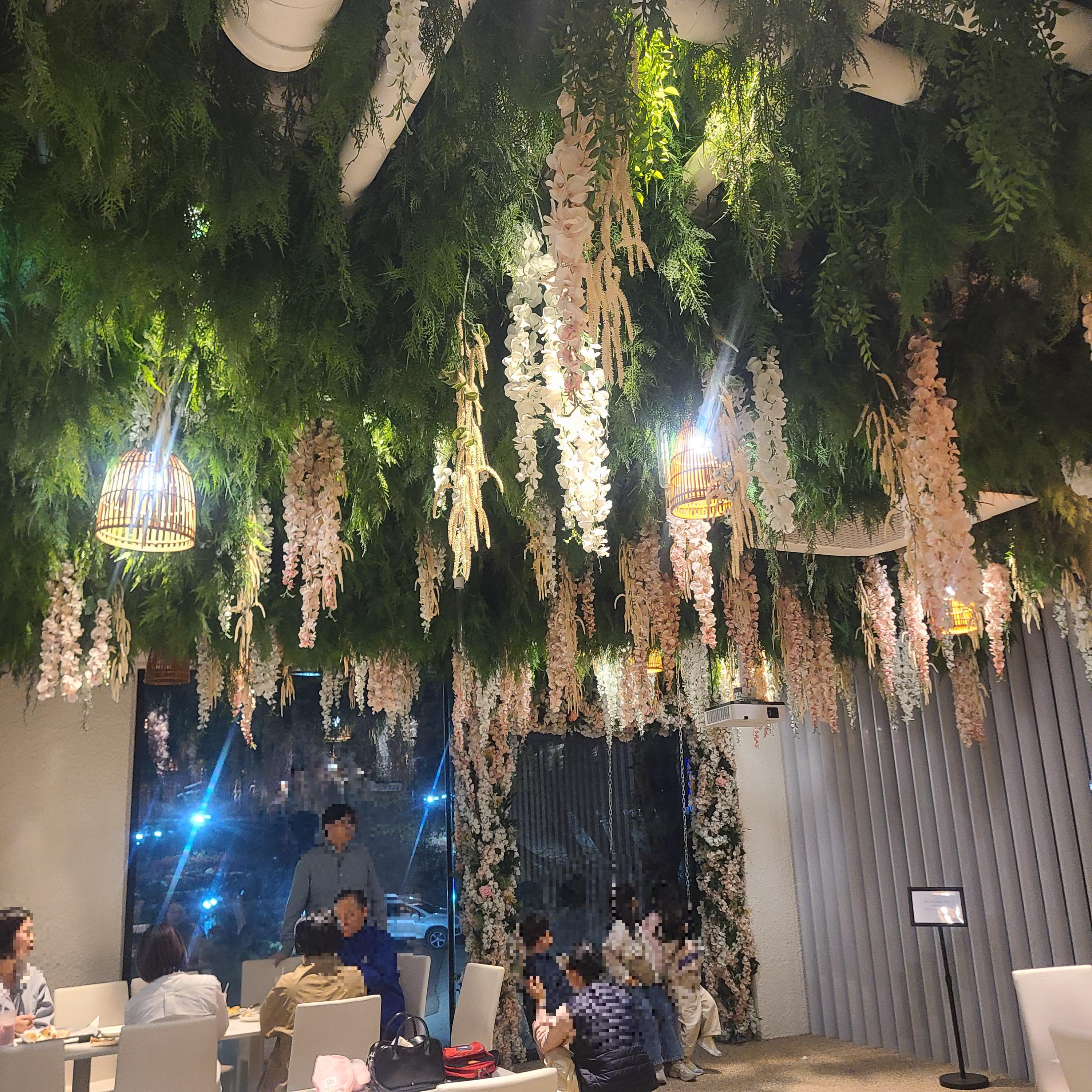 계단 옆으로도 꽃 장식과 함께 테이블이 중간 중간에 배치되어 있어요.